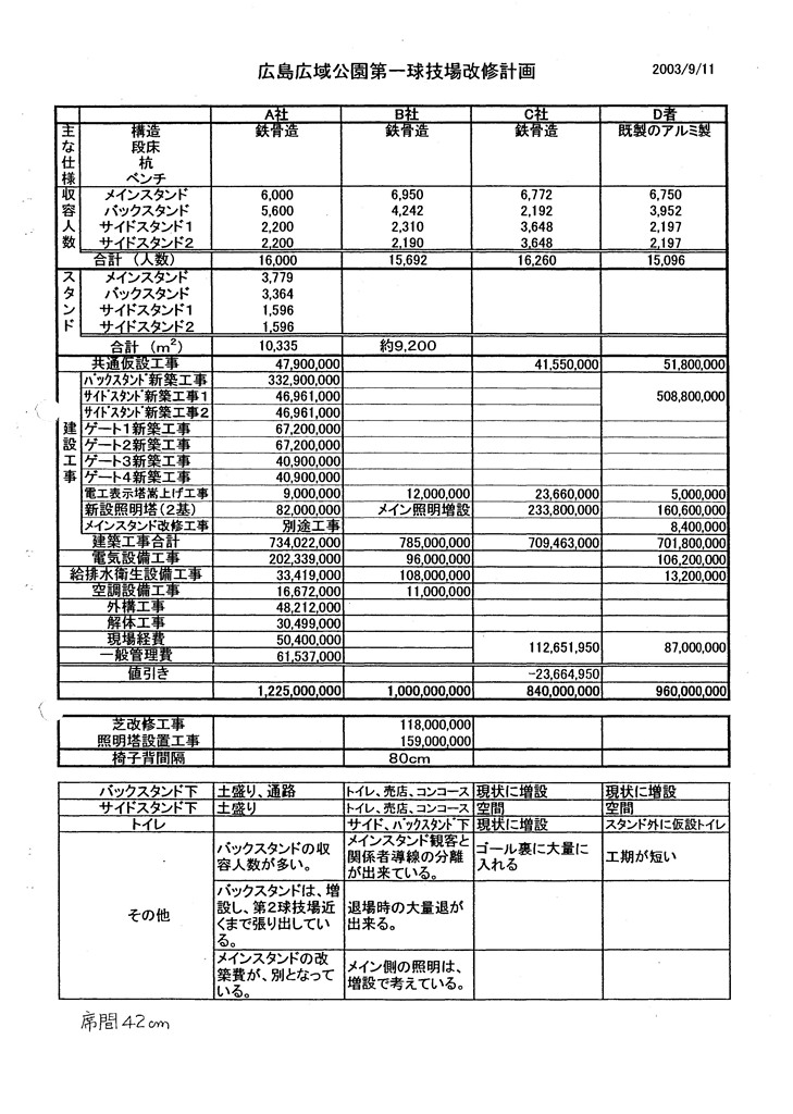 - 改修案はいずれもトイレが少なく、売庖も屋外に仮設を予定している等、ホスピタリティに欠けている。リピーターの増加が期待できないのではないか。いくらつなぎのスタジアムといっても、観戦者が満足できる最低限の施設、附帯設備は必要である。